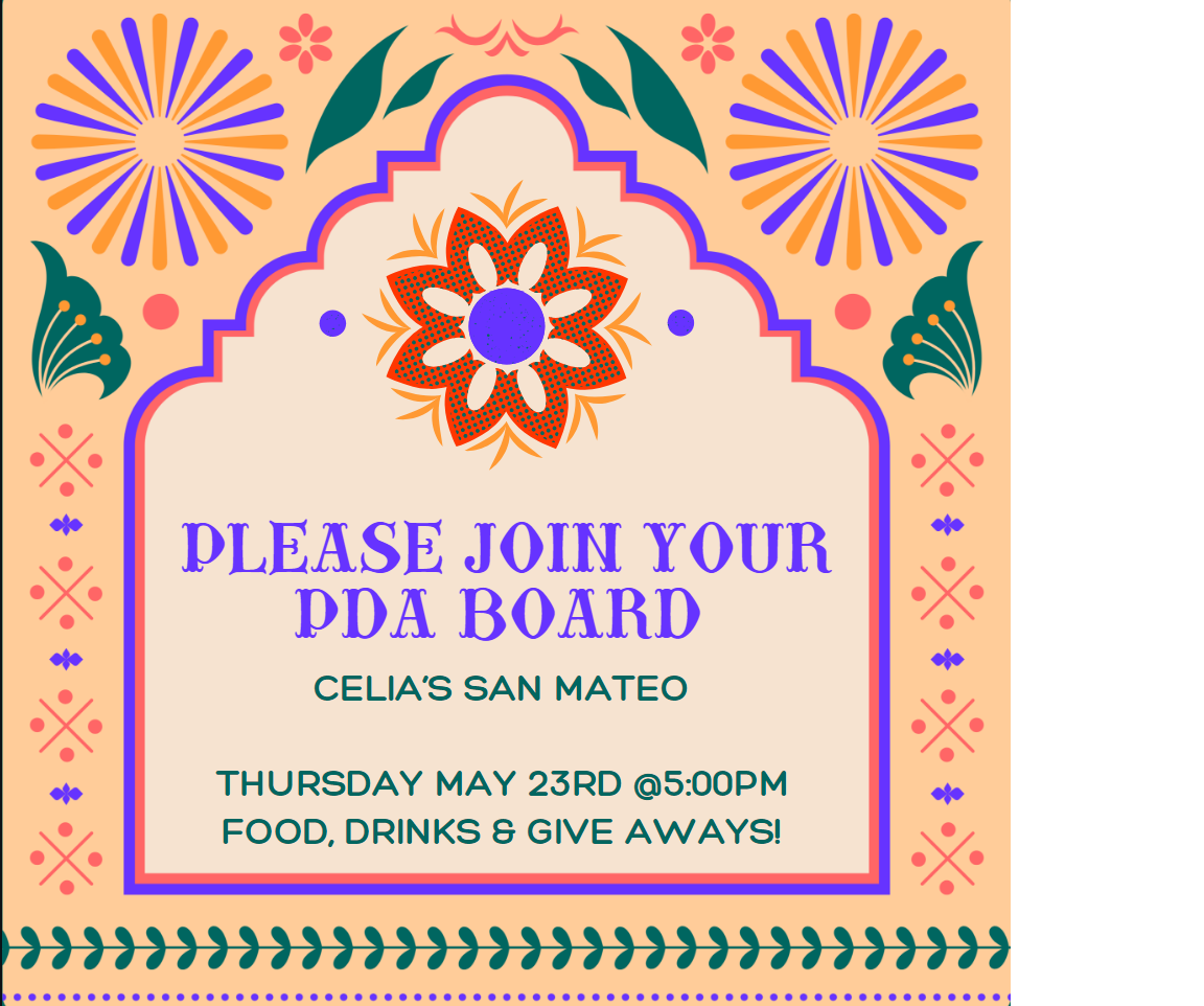 As the flyer says, come join your PDA Board at Celia’s for some food, drinks and giveaways on May 23rd!!! The restaurant is located at:
